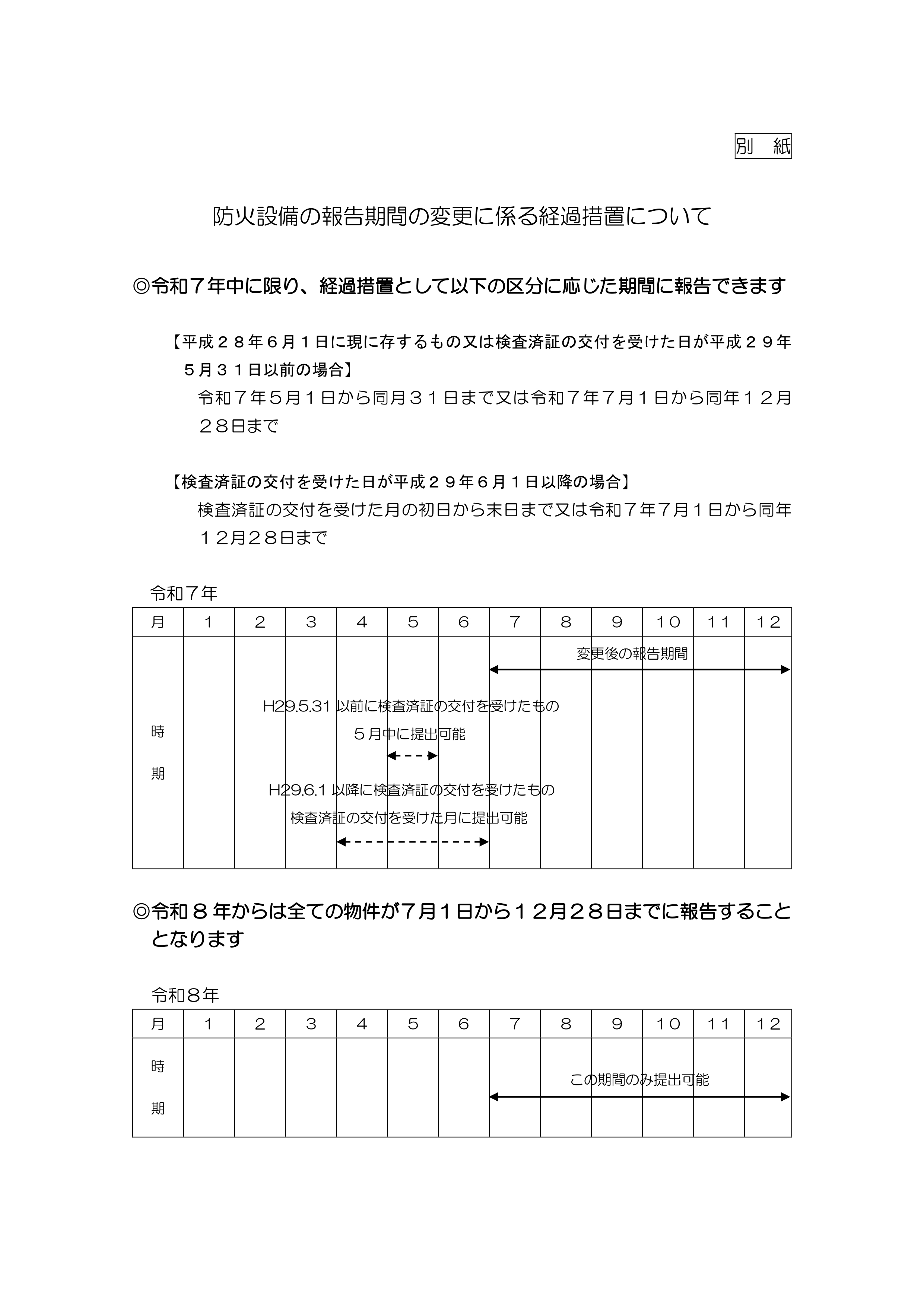 - 令和7年1月1日から、防火設備の定期報告の報告期間が、毎年7月1日から12月28日までに変更されました。